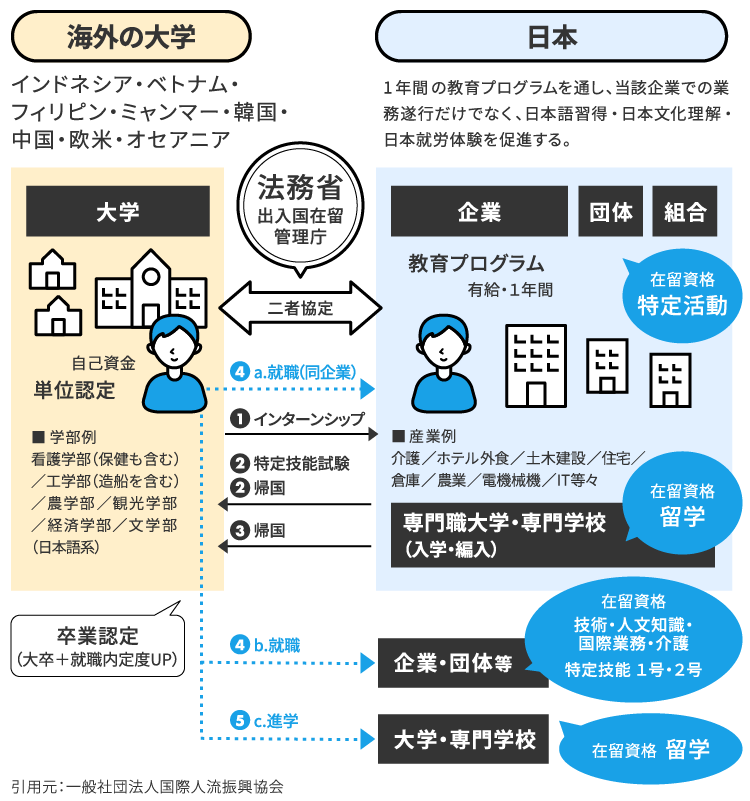 国際インターンシッププログラム(大学卒・学位取得支援インターンシップ)は、海外の大学に在籍する外国人学生が、大学の教育課程の一環として日本企業で就業体験や研修を行うプログラムです。外国人学生がその大学の教育課程の一部としてインターンシップで日本に来る場合、在留資格(特定活動9号)が認められます。このプログラムは以下の要件を満たす必要があります。